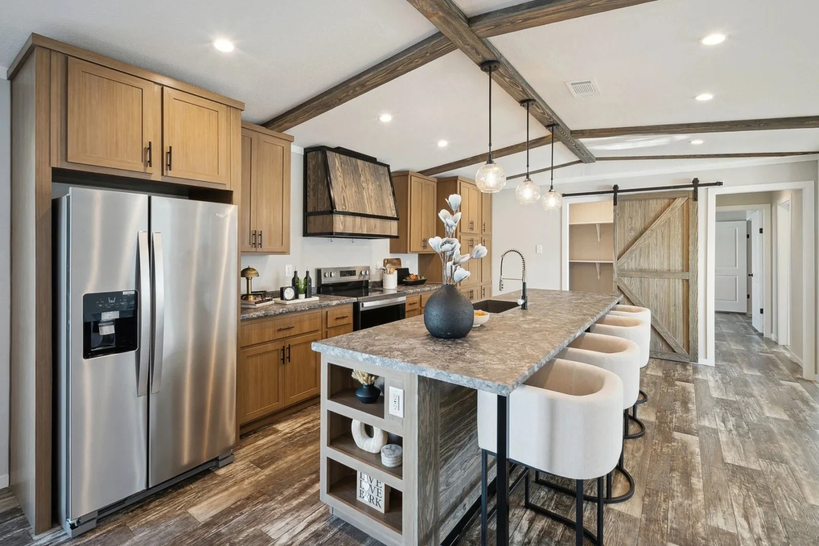 ๐ Elegant Ceilings โ Wood beam accents paired with recessed lighting create a warm, modern farmhouse feel