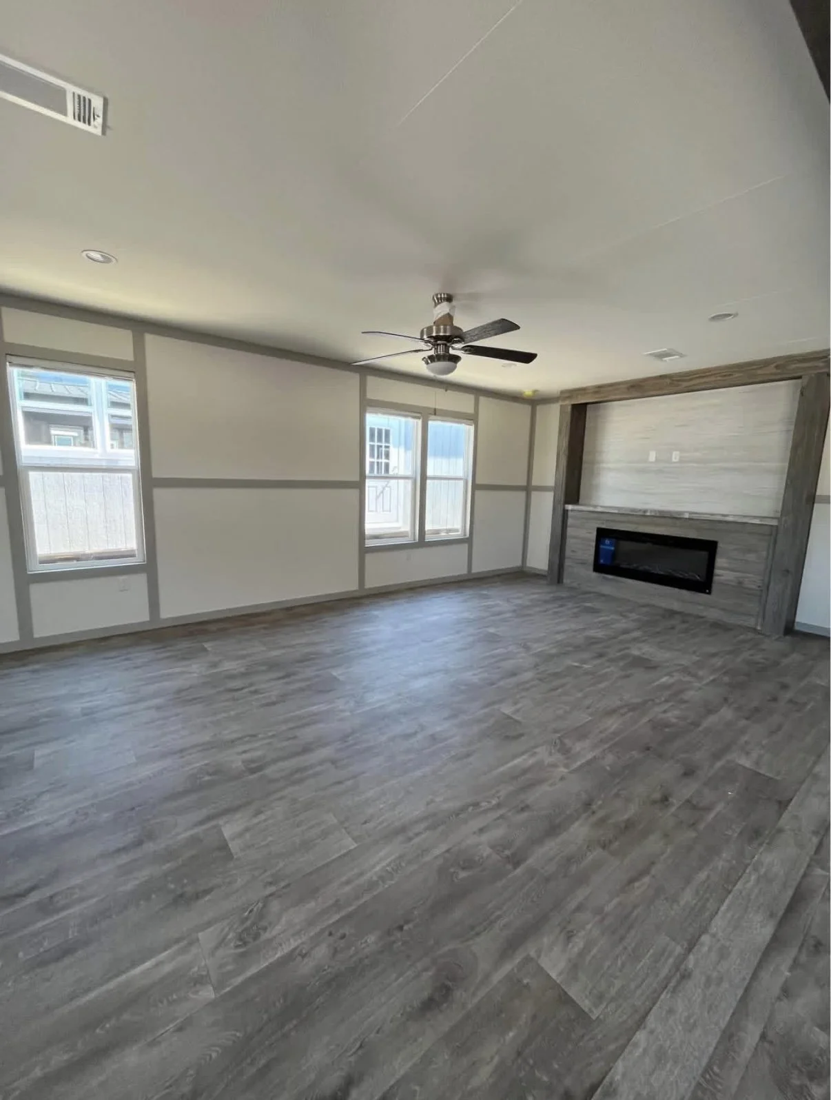 🔥 Inviting Living Room: Spacious open living area with a stunning built-in electric fireplace feature wall, ceiling fan, recessed lighting, and abundant natural light