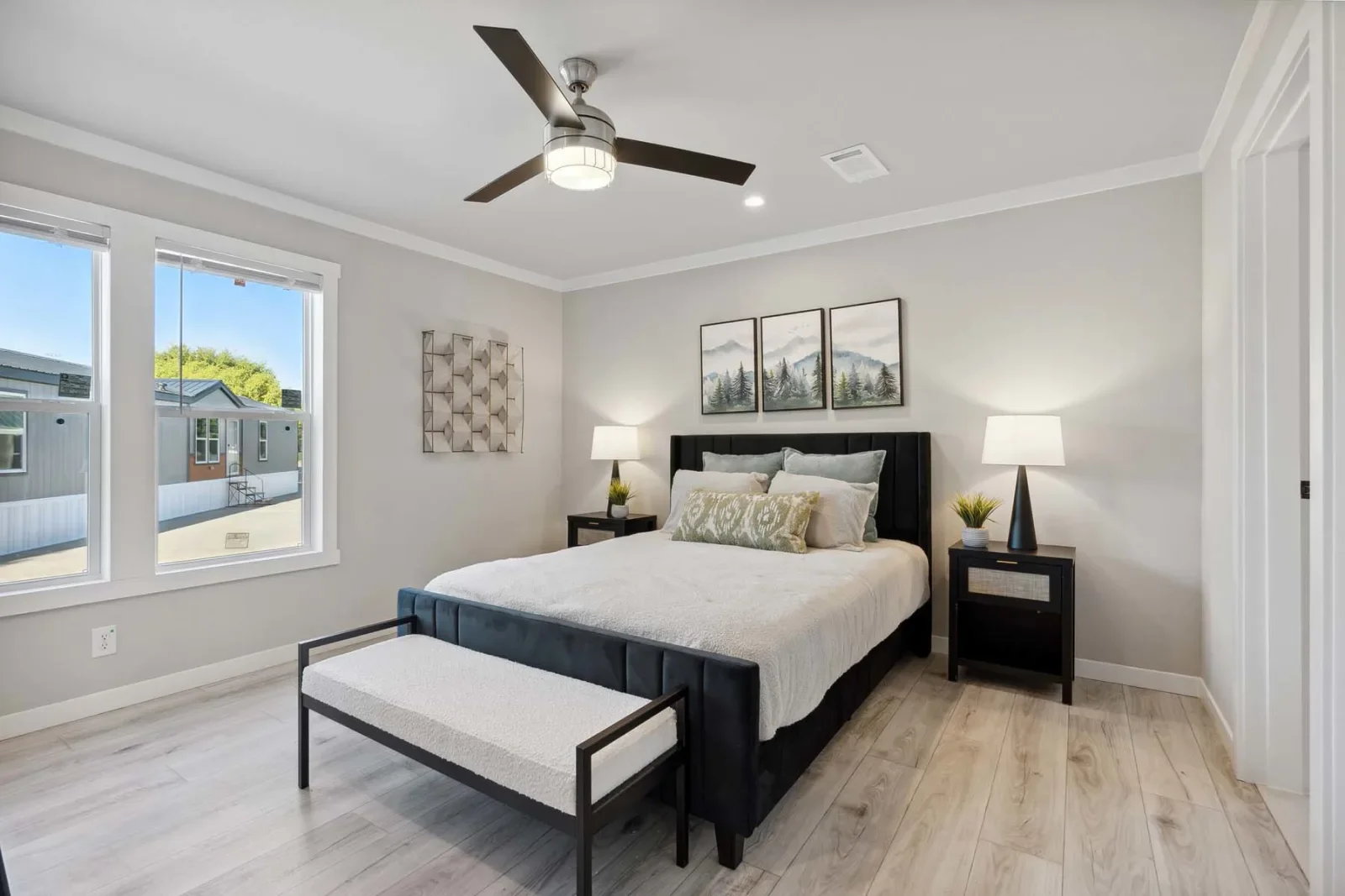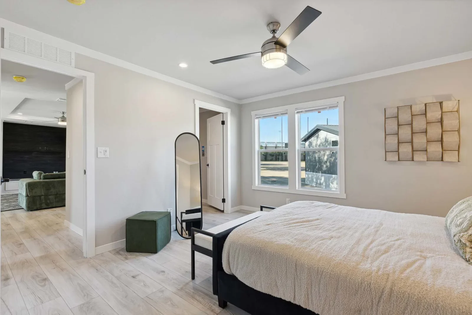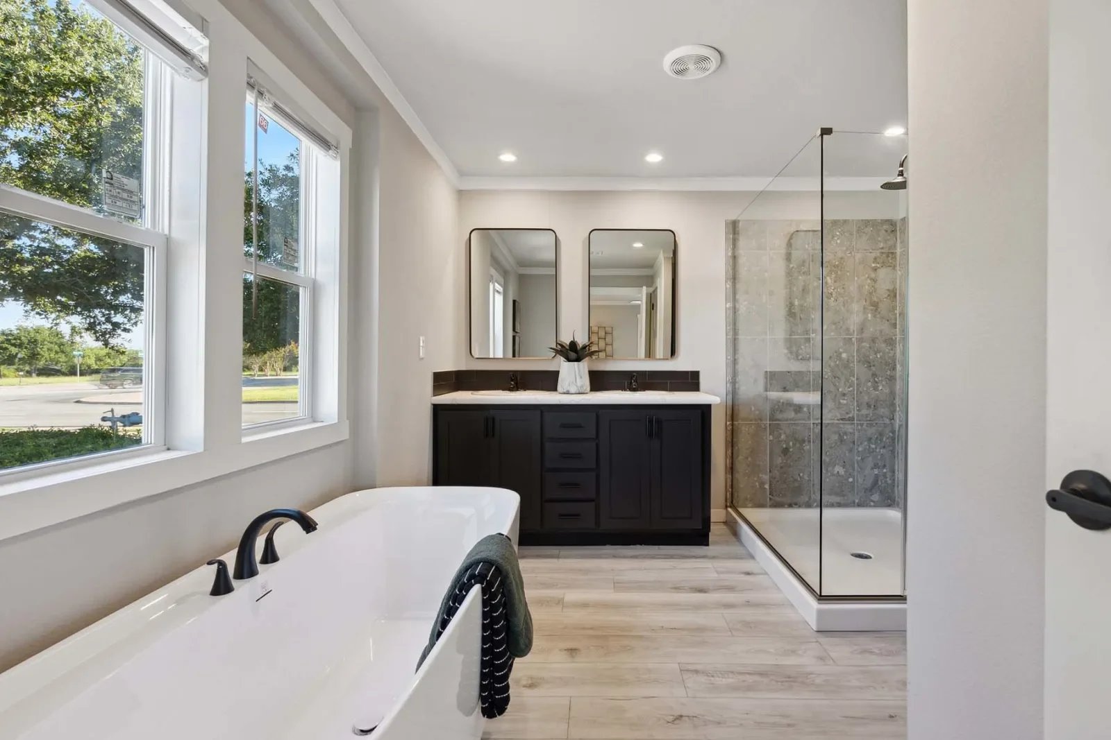 Comfortable primary bedroom with plenty of natural light and a spa-style ensuite bathroom featuring dual sinks, a walk-in glass shower, and a relaxing soaking tub.🛁 Well-Appointed Bathrooms