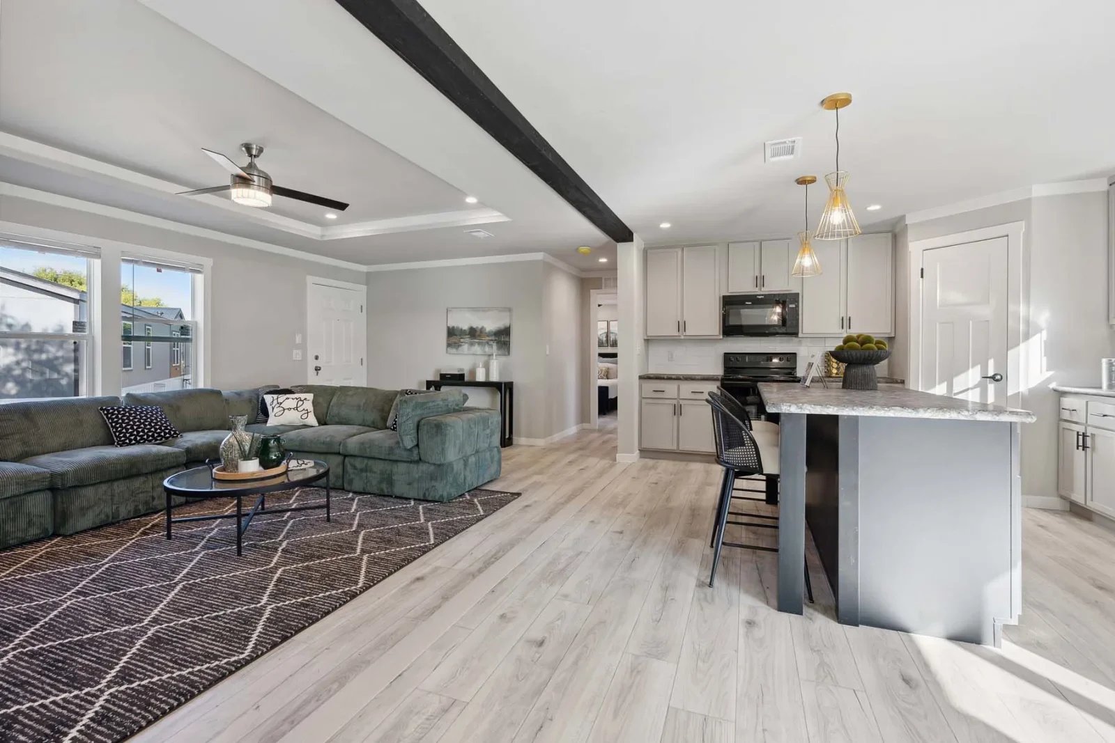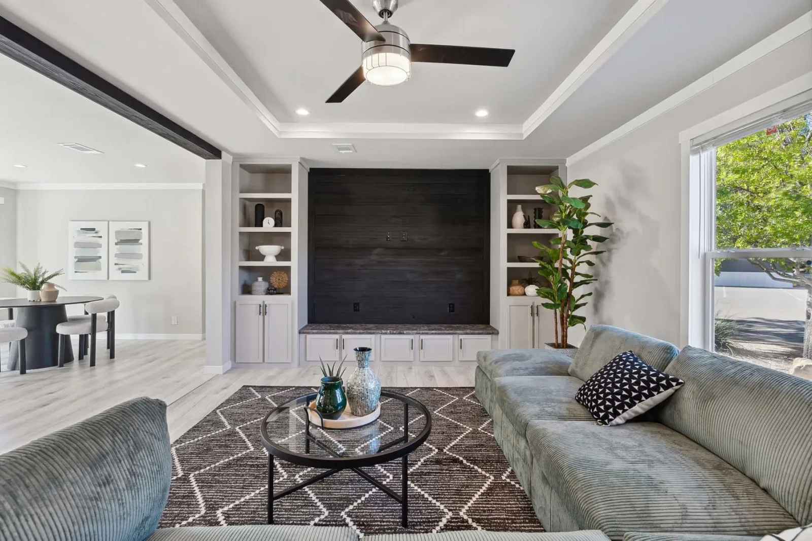 Bright and inviting living space with recessed lighting, tray ceiling, crown molding, and a modern ceiling fan, flowing seamlessly into the kitchen and dining areas.👩🍳 Modern Kitchen with Island