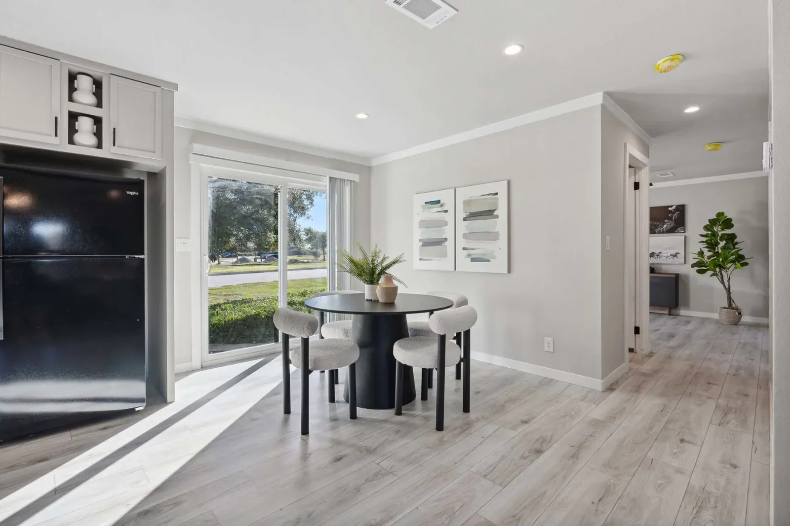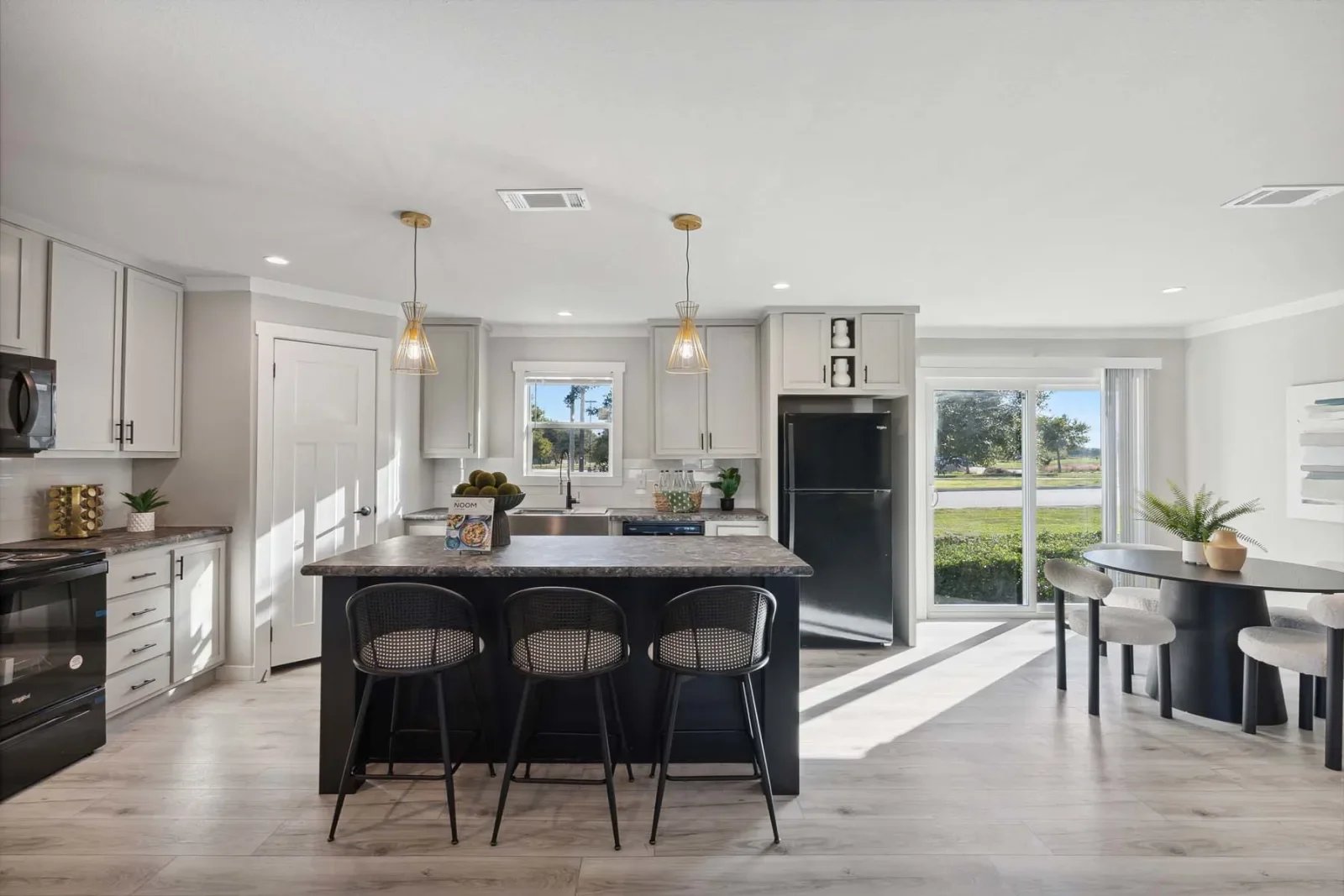 The kitchen features a large center island with seating, ample cabinet storage, modern appliances, and generous counter space, perfect for cooking and entertaining.🍽 Dining Area with Natural Light